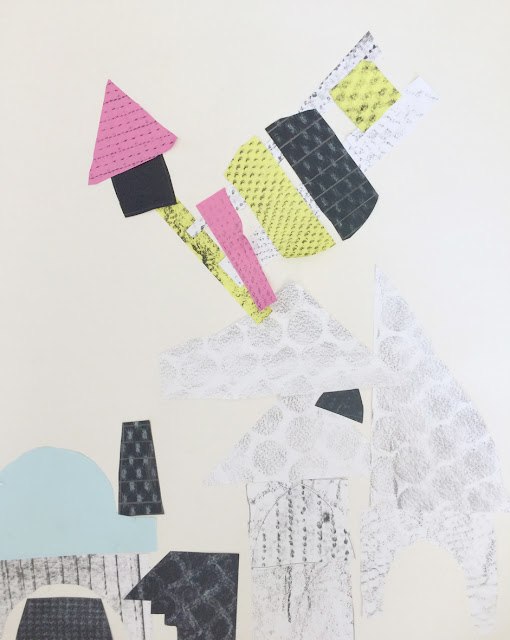 Ultima fase di composizione e collage. La composizione lascia spazio all'immaginazione e alla libertà di interpretazione. Le città che sono emerse sono molteplici: dalle case con molti portici, a palazzi fatti di sole cupole, a ponti, scale. Non sono nemmeno mancati dettagli a tre dimensioni.